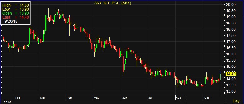 ทั้งนี้ ราคาหุ้น SKY ปรับตัวขึ้นสู.สุดในรอบ 2 เดือน นับตั้งแต่ราคาหุ้นอยู่ที่ระดับ 14.50 บาท เมื่อวันที่ 25 ก.ค.2561