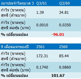 บริษัท มั่นคงเคหะการ จำกัด (มหาชน) หรือ MK รายงานผลการดำเนินงานในไตรมาส 3/2561 สิ้นสุดวันที่ 30 ก.ย.2561 มีผลการดำเนินงานดังนี้