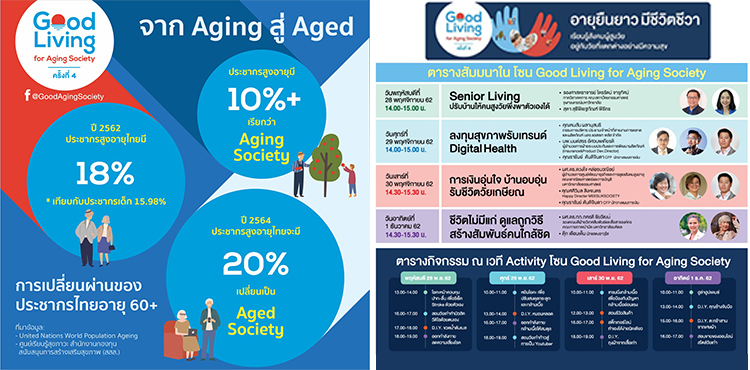 ประกอบกับความต้องการของผู้มาร่วมงานในปีที่ผ่านมา ทำให้การจัดงาน Good Living for Aging Society ครั้งที่ 4 นี้ เน้นให้ความสำคัญกับผู้สูงอายุ โดยเฉพาะกลุ่มผู้สูงอายุที่พึ่งพาตนเองได้ เพื่อเตรียมพร้อมวางแผนด้านการหารายได้ในยามสูงวัย การดูแลสุขภาพให้แข็งแรงยืนยาว มีความเป็นอยู่ที่มีคุณภาพ และได้รับการดูแลจากคนรอบข้างที่เข้าใจผู้สูงวัย