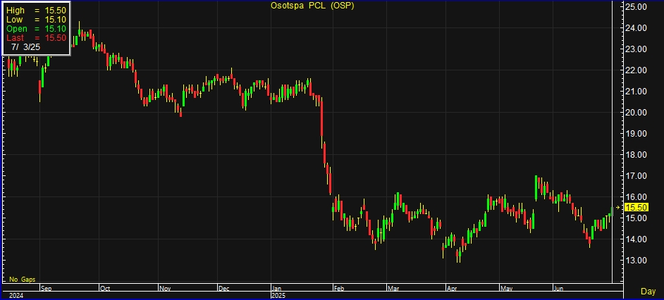 โดยราคาหุ้น OSP ปรับตัวเพิ่มขึ้นต่อเนื่องเป็นวันที่ 4 นับตั้งแต่ราคาปิดที่ระดับ 14.40 บาท คิดเป็นการปรับตัวขึ้นมา 1.10 บาท หรือ 7.64%