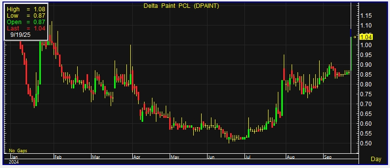 ผู้สื่อข่าวรายงาน วันนี้ (19 ก.ย.68) ราคาหุ้น บริษัท สีเดลต้า จำกัด (มหาชน) หรือ DPAINT ณ เวลา 11.05 น. อยู่ที่ระดับ 1.04 บาท บวก 0.18 บาท หรือ 20.93% สูงสุดที่ระดับ 1.08 บาท ต่ำสุดที่ระดับ 0.87 บาท ด้วยมูลค่าการซื้อขาย 39.62 ล้านบาท