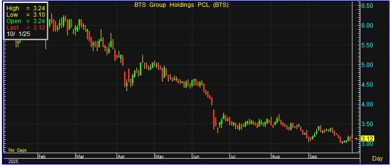 ผู้สื่อข่าวรายงานว่า วันนี้ (1 ต.ค.68) ราคาหุ้น บริษัท บีทีเอส กรุ๊ป โฮลดิ้งส์ จำกัด (มหาชน) หรือ BTS ณ เวลา 10:12 น. อยู่ที่ระดับ 3.12 บาท บวก 0.06 บาท หรือ 1.96% สูงสุดที่ระดับ 3.24 บาท ต่ำสุดที่ระดับ  3.10 บาท ด้วยมูลค่าการซื้อขาย 135.10 ล้านบาท