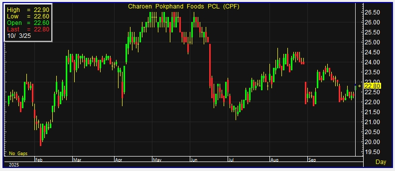 ผู้สื่อข่าวรายงาน วันนี้ (3 ต.ค.68) ราคาหุ้น บริษัท เจริญโภคภัณฑ์อาหาร จำกัด (มหาชน) หรือ CPF ณ เวลา 10:07 น. อยู่ที่ระดับ 22.80 บาท บวก 0.50 บาท หรือ 2.24% สูงสุดที่ระดับ 22.90 บาท ต่ำสุดที่ระดับ 22.60 บาท ด้วยมูลค่าการซื้อขาย 83.67 ล้านบาท