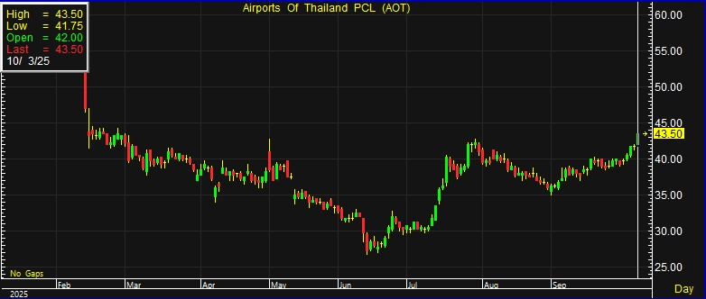 AOT พุ่ง 4% บล.กรุงศรี มองโมเมนตัมบวก รับแรงหนุน Golden Week–นักท่องเที่ยวจีนทะลัก ลุ้น ครม.เคาะแผนท่องเที่ยว พร้อมให้ราคาเป้าหมาย 48 บาท