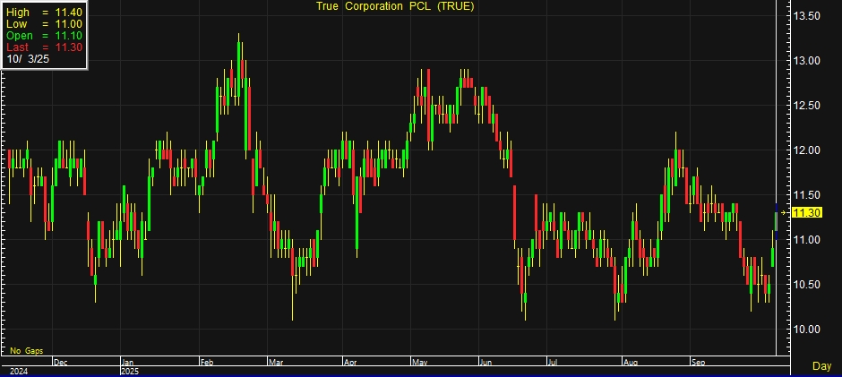 ผู้สื่อข่าวรายงานว่า วันนี้ (3 ต.ค.68) ราคาหุ้น บริษัท ทรู คอร์ปอเรชั่น จำกัด (มหาชน) หรือ TRUE ณ เวลา 14:26 น. อยู่ที่ระดับ 11.30 บาท บวก 0.40 บาท หรือ 3.67% สูงสุดที่ระดับ 11.40 บาท ต่ำสุดที่ระดับ 11.00 บาท ด้วยมูลค่าการซื้อขาย 1.53 พันล้านบาท