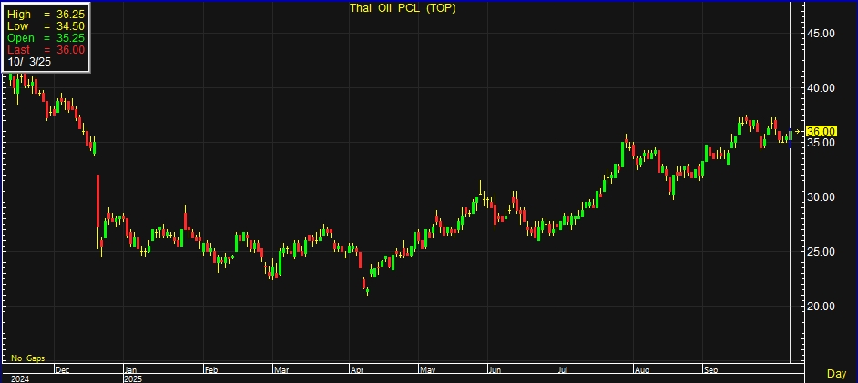 ผู้สื่อข่าวรายงานว่า วันนี้ (3 ต.ค.68) ราคาหุ้น บริษัท ไทยออยล์ จำกัด (มหาชน) หรือ TOP ณ เวลา 15:00 น. อยู่ที่ระดับ 36 บาท บวก 0.50 บาท หรือ 1.41% สูงสุดที่ระดับ 36.25 บาท ต่ำสุดที่ระดับ 34.50 บาท ด้วยมูลค่าการซื้อขาย 340.43 ล้านบาท