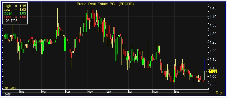 ผู้สื่อข่าวรายงาน วันนี้ (7 ต.ค.68) ราคาหุ้น บริษัท พราว เรียล เอสเตท จำกัด (มหาชน) หรือ PROUD ณ เวลา 10:51 น. อยู่ที่ระดับ 1.08 บาท บวก 0.06 บาท หรือ 5.88% สูงสุดที่ระดับ 1.15 บาท ต่ำสุดที่ระดับ 1.03 บาท มูลค่าการซื้อขาย 1.39 ล้านบาท