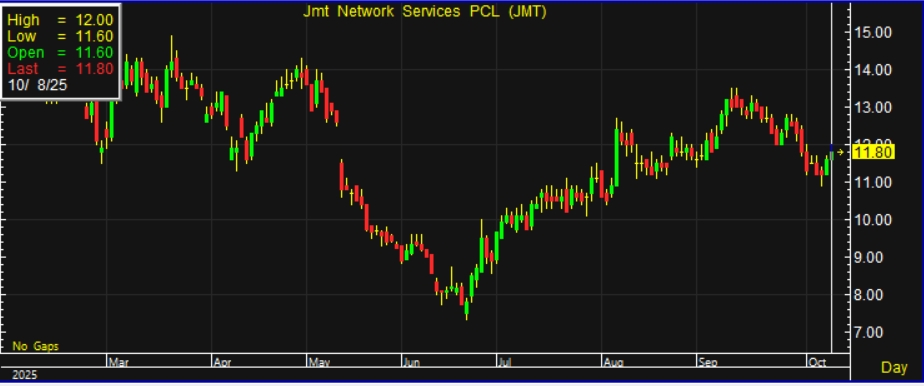 ผู้สื่อข่าวรายงานว่า วันนี้ (8 ต.ค. 68) ราคาหุ้น บริษัท เจ เอ็ม ที เน็ทเวอร์ค เซอร์วิสเซ็ส จำกัด (มหาชน) หรือ JMT ณ เวลา 11:13 น. อยู่ที่ระดับ 11.80 บาท บวก 0.20 บาท หรือ 1.72% สูงสุดที่ระดับ 12.00 บาท ต่ำสุดที่ระดับ 11.60 บาท ด้วยมูลค่าการซื้อขาย 82.31 ล้านบาท