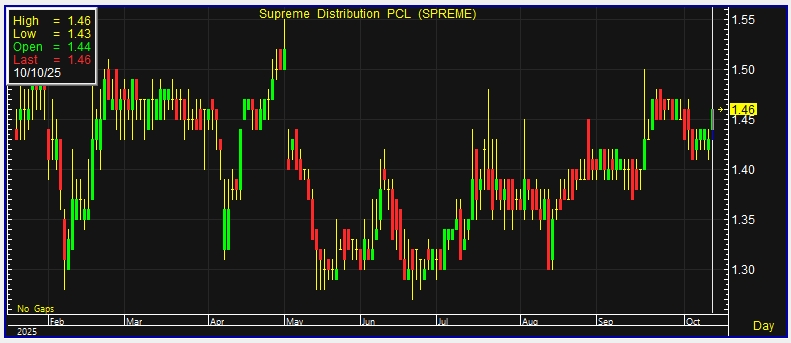 ผู้สื่อข่าวรายงาน วันนี้ (10 ต.ค.68) ราคาหุ้น บริษัท สุพรีม ดิสทิบิวชั่น จำกัด (มหาชน) หรือ SPREME ณ เวลา 14:29 น. อยู่ที่ระดับ 1.46 บาท บวก 0.03 บาท หรือ 2.10% สูงสุดที่ระดับ 1.46 บาท ต่ำสุดที่ระดับ 1.43 บาท ด้วยมูลค่าการซื้อขาย 0.45 ล้านบาท