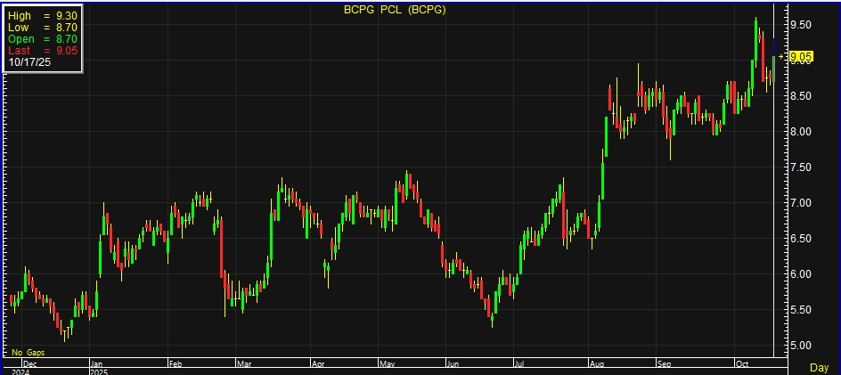 ผู้สื่อข่าวรายงานว่า วันนี้ (17 ต.ค.68) ราคาหุ้น บริษัท บีซีพีจี จำกัด (มหาชน) หรือ BCPG ณ เวลา 15:22 น. อยู่ที่ระดับ 9.05 บาท บวก 0.30 บาท หรือ 3.43% สูงสุดที่ระดับ 9.30 บาท ต่ำสุดที่ระดับ 8.70 บาท ด้วยมูลค่าการซื้อขาย 246.04 ล้านบาท