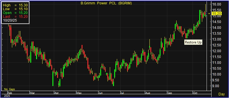 ผู้สื่อข่าวรายงานว่า วันนี้ (20 ต.ค.68) ราคาหุ้น บริษัท บี.กริม เพาเวอร์ จำกัด (มหาชน) หรือ BGRIM ณ เวลา 10:29 น. อยู่ที่ระดับ 15.20 บาท บวก 0.10 บาท หรือ 0.66% ราคาสูงสุดอยู่ที่ 15.30 บาท ราคาต่ำสุดอยู่ที่ 15.10 บาท ด้วยมูลค่าการซื้อขาย 85.75 ล้านบาท