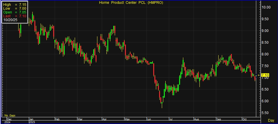 ผู้สื่อข่าวรายงานว่า วันนี้ (20 ต.ค.68) ราคาหุ้น บริษัท โฮม โปรดักส์ เซ็นเตอร์ จำกัด (มหาชน) หรือ HMPRO ณ เวลา 11:25 น. อยู่ที่ระดับ 7.10 บาท บวก 0.20 บาท หรือ 2.90% สูงสุดที่ระดับ 7.15 บาท ต่ำสุดที่ระดับ 7 บาท ด้วยมูลค่าการซื้อขาย 60.74 ล้านบาท