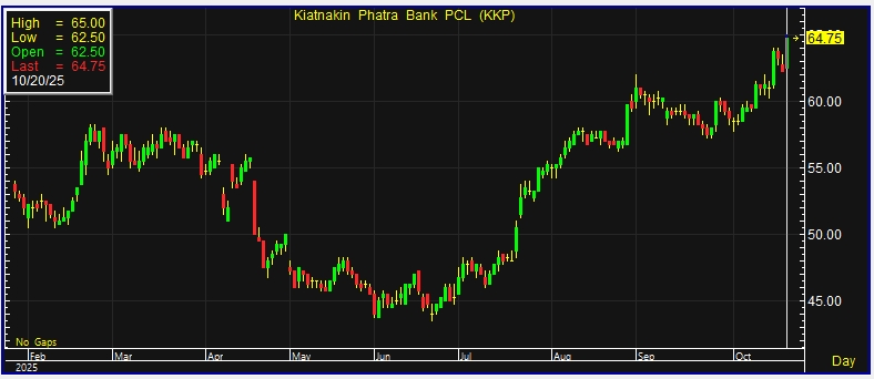 ผู้สื่อข่าวรายงาน วันนี้ (20 ต.ค.68) ราคาหุ้น ธนาคารเกียรตินาคินภัทร จำกัด (มหาชน) หรือ KKP ณ เวลา 14:13 น. อยู่ที่ระดับ 64.75 บาท บวก 2.50 บาท หรือ 4.02% สูงสุดที่ระดับ 65.00 บาท ต่ำสุดที่ระดับ 62.50 บาท ด้วยมูลค่าการซื้อขาย 260.27 ล้านบาท