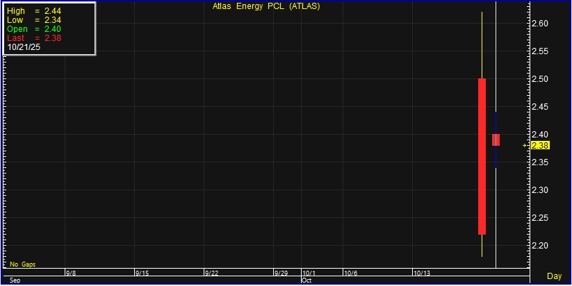 ผู้สื่อข่าวรายงานว่า วันนี้ (21 ต.ค.68) ราคาหุ้น บริษัท แอตลาส เอ็นเนอยี จำกัด (มหาชน) หรือ ATLAS ณ เวลา 10:07 น. อยู่ที่ระดับ 2.38 บาท บวก 0.16 บาท หรือ 7.21% สูงสุดที่ระดับ 2.44 บาท ต่ำสุดที่ระดับ 2.34 บาท ด้วยมูลค่าการซื้อขาย 85.57 ล้านบาท