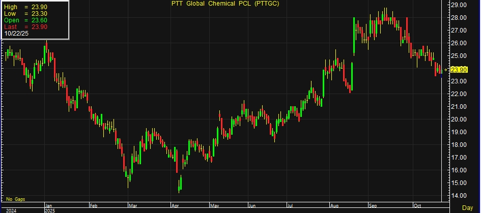 ด้านบริษัทหลักทรัพย์ กรุงศรี จำกัด (มหาชน) ระบุว่า มอง Negative ต่อขาดทุนไตรมาส 3/2568 ของ PTTGC คาดอยู่ที่ 2,601 ล้านบาท แม้ฟื้นตัวจากไตรมาส 3/2567 แต่น้อยกว่าที่เคยประเมินจาก product spread ปิโตรเคมีที่แย่กว่าคาด จากผลกระทบสงครามการค้า จึงปรับลดประมาณการสะท้อนผลกระทบดังกล่าว อย่างไรก็ตาม core operation ของ PTTGC ในช่วงครึ่งหลังปีนี้ (มีปิดซ่อมใหญ่) ยัง bottom out จากช่วงครึ่งหลังปี 2567 และคาดฟื้นตัวต่อในปี 2569 ลดค่าใช้จ่ายคงที่ได้มากขึ้น, ไม่มีปิดซ่อมใหญ่โรงกลั่น และอำนาจต่อรองสูงขึ้น หลังผู้ผลิตทั่วโลกทยอย rationalized การผลิต ดังนั้นคงคำแนะนำ “ซื้อ” ราคาเป้าหมาย 25 บาท (ปี 2569 อยู่ที่ 28 บาท) มอง PTTGC อยู่รอดในช่วง downcycle และฟื้นตัวได้ในระยะยาว