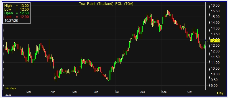 ผู้สื่อข่าวรายงาน วันนี้ (27 ต.ค.68) ราคาหุ้น บริษัท ทีโอเอ เพ้นท์ (ประเทศไทย) จำกัด (มหาชน) หรือ TOA ณ เวลา 14:33 น. อยู่ที่ระดับ 12.90 บาท บวก 0.40 บาท หรือ 3.20% สูงสุดที่ระดับ 13.00 บาท ต่ำสุดที่ระดับ 12.50 บาท ด้วยมูลค่าการซื้อขาย 25.47 ล้านบาท