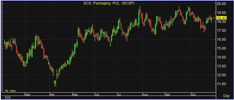 ผู้สื่อข่าวรายงานว่า วันนี้(28ต.ค.68) ราคาหุ้นบริษัท เอสซีจี แพคเกจจิ้ง จำกัด (มหาชน) หรือ SCGP ณ เวลา 14:57 น. อยู่ที่ระดับ 18.40 บาท บวก 0.20 บาท หรือ 1.10% ราคาสูงสุด 18.50 บาท ราคาต่ำสุด 17.90 ล้านบาท ด้วยมูลค่าซื้อขาย 180.19 ล้านบาท