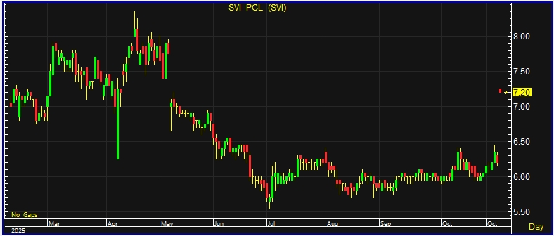 ผู้สื่อข่าวรายงานว่า วันนี้(3พ.ย.68) บริษัท เอสวีไอ จำกัด (มหาชน) หรือ SVI ณ เวลา 10.06 น. อยู่ที่ระดับ 7.20 บาท บวก 1.00 บาท หรือ 16.13% ราคาสูงสุด 7.25 บาท ราคาต่ำสุด 7.20 บาท ด้วยมูลค่าซื้อขาย 26.98 ล้านบาท