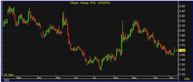 บริษัทหลักทรัพย์ ทรีนีตี้ จำกัด ระบุว่า สำหรับ CHAYO ให้ราคาเป้าหมายใหม่ที่ 2.14 บาท โดยยังคงประมาณการกำไรปี 2568 ไว้ที่ 317 ล้านบาท เพิ่ม 32% เทียบจากช่วงเดียวกันของปีก่อนโดยราคาหุ้นปัจจุบันซื้อขายกันที่ PBV 0.35 เท่า ถือว่าสะท้อนปัจจัยลบและความกังวลไปมากแล้ว