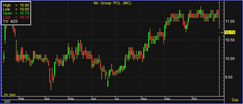 ผู้สื่อข่าวรายงานว่า วันนี้ (4 พ.ย.68) มีหลักทรัพย์ราคาหุ้นอ่อนตัวลงตามทฤษฎีเมื่อวันขึ้นเครื่องหมาย XD ซึ่งผู้ซื้อหลักทรัพย์ไม่ได้สิทธิรับเงินปันผล ทำให้ราคาหุ้นปรับตัวลดลง ล่าสุด ณ เวลา 10:06 น. ราคาหุ้น บริษัท แม็คกรุ๊ป จำกัด (มหาชน) หรือ MC อยู่ที่ระดับ 10.70 บาท ลบ 0.50 บาท หรือ 4.46% สูงสุดที่ระดับ 10.80 บาท ต่ำสุดที่ระดับ 10.60 บาท ด้วยมูลค่าการซื้อขาย 11.16 ล้านบาท