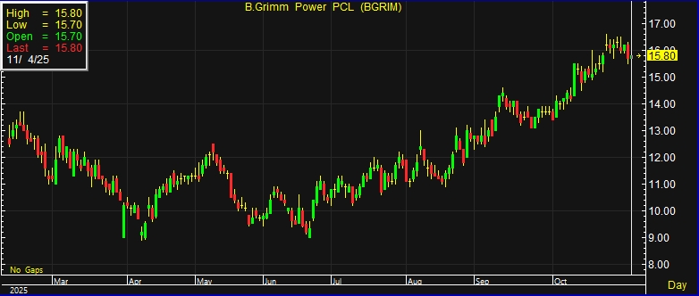 ผู้สื่อข่าวรายงานว่า วันนี้ (4 พ.ย.68) ราคาหุ้น บริษัท บี.กริม เพาเวอร์ จำกัด (มหาชน) หรือ BGRIM ณ เวลา 10:23 น. อยู่ที่ระดับ 15.80 บาท บวก 0.10 บาท หรือ 0.64% ราคาสูงสุดอยู่ที่ 15.80 บาท ราคาต่ำสุดอยู่ที่ 15.70 บาท ด้วยมูลค่าการซื้อขาย 11.91 ล้านบาท