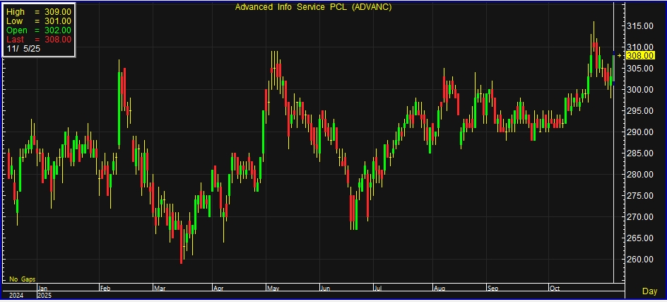 ผู้สื่อข่าวรายงานว่า วันนี้ (5 พ.ย.68) ราคาหุ้น บริษัท แอดวานซ์ อินโฟร์ เซอร์วิส จำกัด (มหาชน) หรือ ADVANC ณ เวลา 10:15 น. อยู่ที่ระดับ 308 บาท บวก 5 บาท หรือ 1.65% สูงสุดที่ระดับ 309 บาท ต่ำสุดที่ระดับ 301 บาท ด้วยมูลค่าการซื้อขาย 953.69 ล้านบาท