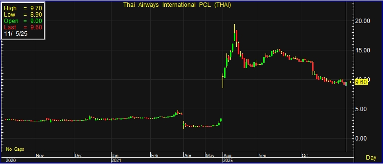 สำหรับราคาหุ้นดีดกลับขึ้นมา ตอบรับข่าวคณะกรรมการสรรหาและกำหนดค่าตอบแทนบริษัท การบินไทย จำกัด (มหาชน) หรือ THAI ที่มีนางสาวกุลยา ตันติเตมิท อธิบดีกรมสรรพากร ในฐานะประธานฯ จะพิจารณารายชื่อที่ผู้ถือหุ้นบริษัทการบินไทยเสนอมา 16 ราย และคัดให้เหลือเพียง 8 ราย หลังจากนั้นจะเสนอรายชื่อ พร้อมคำแนะนำ เข้าสู่ที่ประชุมคณะกรรมการการบินไทย วันที่ 6 พ.ย. 2568 เพื่อพิจารณารับทราบและบรรจุเป็นวาระการประชุมสามัญผู้ถือหุ้นช่วงเดือนธ.ค. 2568 ต่อไป