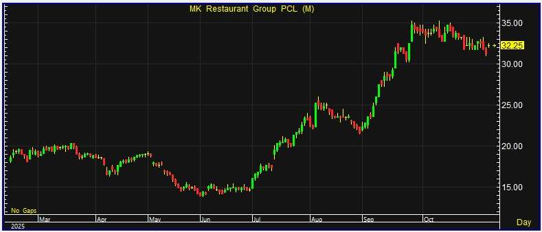 ผู้สื่อข่าวรายงานว่า วันนี้ (6 พ.ย.68) ราคาหุ้นบริษัท เอ็มเค เรสโตรองต์ กรุ๊ป จำกัด (มหาชน) หรือ M ณ เวลา 32.25 บาท บวก 1.00 บาท หรือ 3.20% ราคาต่ำสุด 32.00 บาท ราคาสูงสุด 32.50 บาท ด้วยมูลค่าซื้อขาย 18.31 ล้านบาท