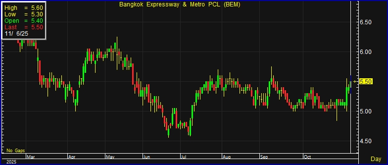 ผู้สื่อข่าวรายงานว่า วันนี้ (6 พ.ย.68) ราคาหุ้น บริษัท ทางด่วนและรถไฟฟ้ากรุงเทพ จำกัด (มหาชน) หรือ BEM ณ เวลา 14:32 น. อยู่ที่ระดับ 5.50 บาท บวก 0.10 บาท หรือ 1.85% สูงสุดที่ระดับ 5.60 บาท ต่ำสุดที่ระดับ 5.30 บาท ด้วยมูลค่าการซื้อขาย 217.09 ล้านบาท