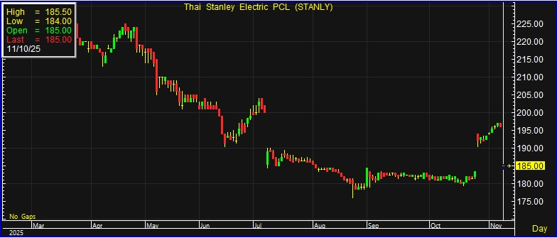 ผู้สื่อข่าวรายงานว่า วันนี้ (10 พ.ย.68) มีหลักทรัพย์ราคาหุ้นอ่อนตัวลงตามทฤษฎีเมื่อวันขึ้นเครื่องหมาย XD ซึ่งผู้ซื้อหลักทรัพย์ไม่ได้สิทธิรับเงินปันผล ทำให้ราคาหุ้นปรับตัวลดลง ล่าสุด ณ เวลา 10:32 น. ราคาหุ้น บริษัท ไทยสแตนเลย์การไฟฟ้า จำกัด (มหาชน) หรือ STANLY อยู่ที่ระดับ 185 บาท ลบ 11.00 บาท หรือ 5.61% สูงสุดที่ระดับ 185.50 บาท ต่ำสุดที่ระดับ 184 บาท ด้วยมูลค่าการซื้อขาย 2.91 ล้านบาท