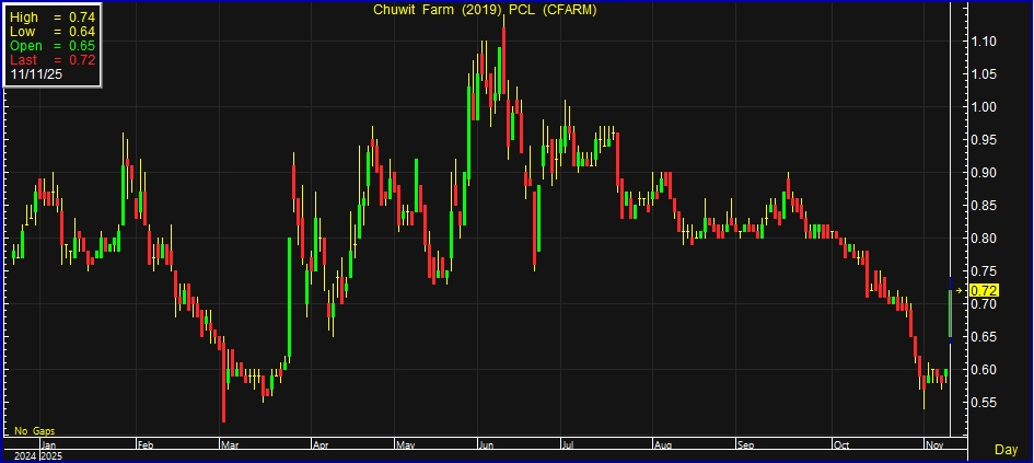ผู้สื่อข่าวรายงานว่า วันนี้ (11 พ.ย.68) ราคาหุ้น บริษัท ชูวิทย์ฟาร์ม (2019) จำกัด (มหาชน) หรือ CFARM ณ เวลา 10:18 น. อยู่ที่ระดับ 0.72 บาท บวก 0.12 บาท หรือ 20% สูงสุดที่ระดับ 0.74 บาท ต่ำสุดที่ระดับ 0.64 บาท ด้วยมูลค่าการซื้อขาย 3.70 ล้านบาท