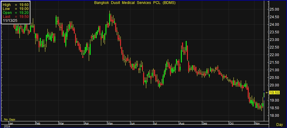 ผู้สื่อข่าวรายงานว่า วันนี้ (13 พ.ย.68) ราคาหุ้น บริษัท กรุงเทพดุสิตเวชการ จำกัด (มหาชน) หรือ BDMS ณ เวลา 10:10 น. อยู่ที่ระดับ 19.50 บาท บวก 0.70 บาท หรือ 3.72% สูงสุดที่ระดับ 19.60 บาท ต่ำสุดที่ระดับ 19.00 บาท ด้วยมูลค่าการซื้อขาย 834.19 ล้านบาท