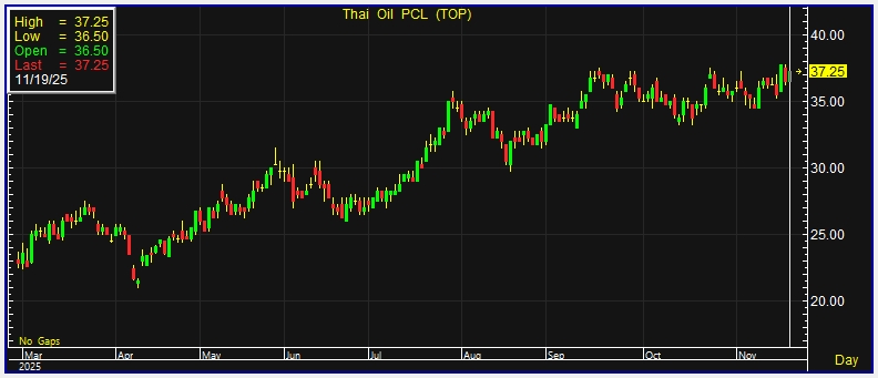 ผู้สื่อข่าวรายงานว่า วันนี้(19 พ.ย.68)ราคาหุ้นบริษัท ไทยออยล์ จำกัด (มหาชน) หรือ TOP ณ เวลา 10:29 น. อยู่ที่ระดับ 37.25 บาท บวก 0.75 บาท หรือ 2.05% ราคาสูงสุด 37.25 บาท ราคาต่ำสุด 36.50 บาท ด้วยมูลค่าซื้อขาย 55.87 ล้านบาท