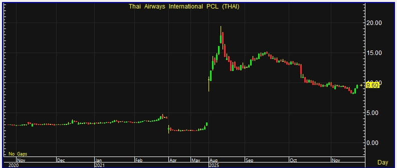 อย่างไรก็ตาม ในระยะสั้นหุ้น THAI ยังคงมีปัจจัยลบกดดันจากการเข้ามาแทรกแซงกิจการของภาครัฐ ซึ่ง THAI จะมีการจัดประชุมสามัญผู้ถือหุ้นประจำปี 2567 เพื่อเลือกกรรมการใหม่ในวันที่ 19 ธันวาคม 2568 และ Silent Periodหุ้นเพิ่มทุน (ต้นทุน 2.5452-4.48 บาทต่อหุ้น) จำนวน 6.6 พันล้านหุ้นในเดือนกุมภาพันธ์ 2569 และอีก 2 หมื่นล้านหุ้นในเดือนสิงหาคม 2569