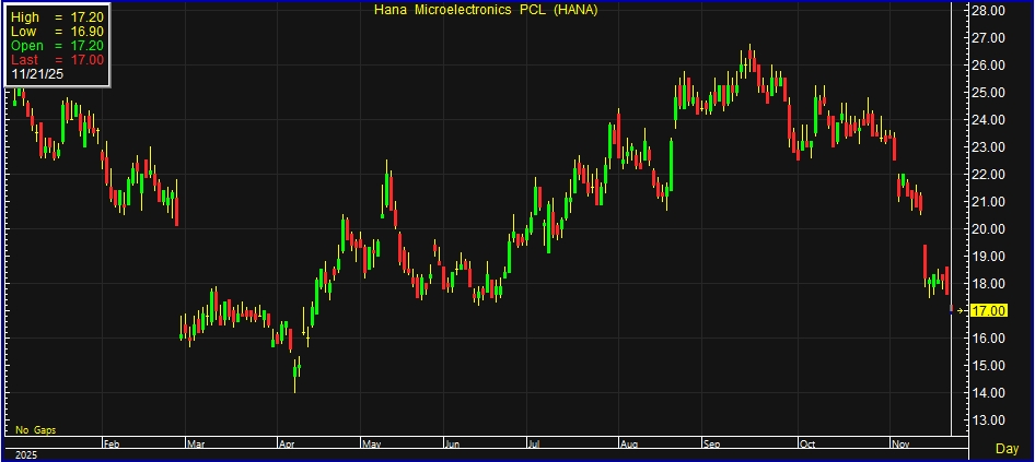 ผู้สื่อข่าวรายงานว่า วันนี้ (21 พ.ย.68) ราคาหุ้นของ บริษัท ฮานา ไมโครอิเล็คโทรนิคส จำกัด (มหาชน) หรือ HANA ณ เวลา 10:12 น. อยู่ที่ระดับ 17 บาท ลบ 0.60 บาท หรือ 3.41% สูงสุดที่ระดับ 17.20 บาท ต่ำสุดที่ระดับ 16.90 บาท ด้วยมูลค่าการซื้อขาย 67.57 ล้านบาท
