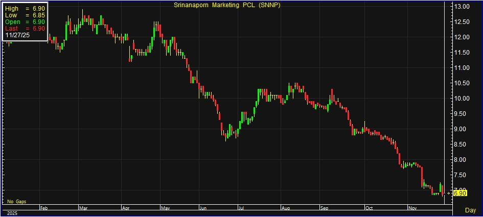 ผู้สื่อข่าวรายงานว่า วันนี้ (27 พ.ย.68) ราคาหุ้น บริษัท ศรีนานาพร มาร์เก็ตติ้ง จำกัด (มหาชน) หรือ SNNP ณ เวลา 10:31 น. อยู่ที่ระดับ 6.90 บาท บวก 0.05 บาท หรือ 0.73% สูงสุดที่ระดับ 6.90 บาท ต่ำสุดที่ระดับ 6.85 บาท ด้วยมูลค่าการซื้อขาย 0.14 ล้านบาท