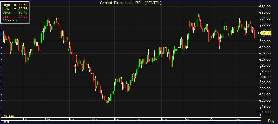 ผู้สื่อข่าวรายงานว่า วันนี้ (27 พ.ย.68) ราคาหุ้น บริษัท โรงแรมเซ็นทรัลพลาซา จำกัด (มหาชน) หรือ CENTEL ณ เวลา 10:43 น. อยู่ที่ระดับ 31.25 บาท บวก 0.50 บาท หรือ 1.63% สูงสุดที่ระดับ 31.50 บาท ต่ำสุดที่ระดับ 30.75 บาท ด้วยมูลค่าการซื้อขาย 13.95 ล้านบาท