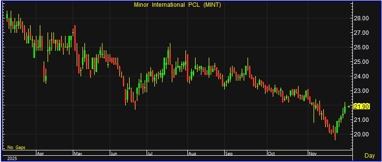 ผู้สื่อข่าวรายงานว่า วันนี้(28 พ.ย.68) ราคาหุ้นบริษัท ไมเนอร์ อินเตอร์เนชั่นแนล จํากัด (มหาชน) หรือ MINT ณ เวลา 14:17 น. อยู่ที่ระดับ 21.90 บาท บวก 0.50 บาท หรือ 2.34% ราคาสูงสุด 22.20 บาท ราคาต่ำสุด 21.40 บาท ด้วยมูลค่าซื้อขาย 534.81 ล้านบาท