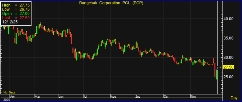 ผู้สื่อข่าวรายงานว่า วันนี้ (2 ธ.ค. 68)ราคาหุ้น บริษัท บางจาก คอร์ปอเรชั่น จำกัด (มหาชน) หรือ BCP ณ เวลา 10:24 น. อยู่ที่ระดับ 27.50 บาท บวก 0.75 บาท หรือ 2.80% สูงสุดที่ระดับ 27.75 บาท ต่ำสุดที่ระดับ 26.75 บาท ด้วยมูลค่าการซื้อขาย 84.60 ล้านบาท