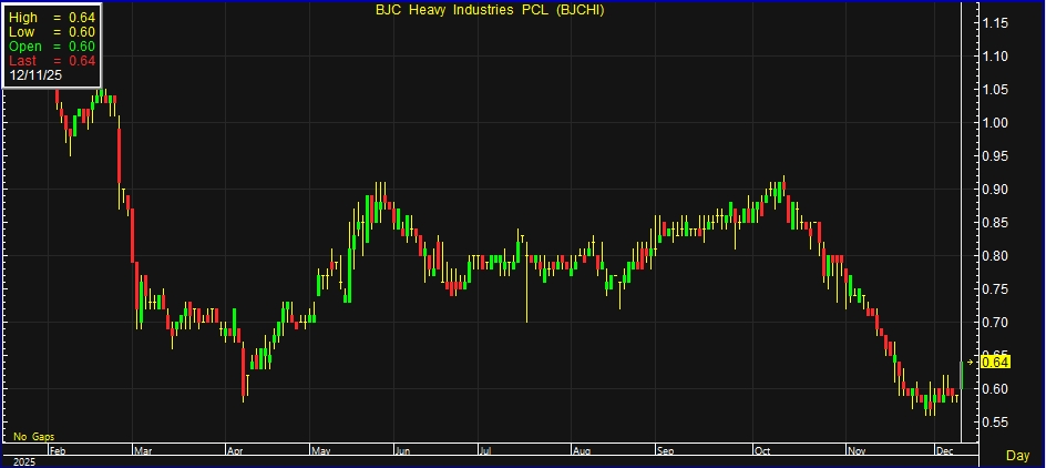 ผู้สื่อข่าวรายงานว่า วันนี้ (11 ธ.ค.68) ราคาหุ้น บริษัท บีเจซี เฮฟวี่ อินดัสทรี จำกัด (มหาชน) หรือ BJCHI ณ เวลา 10:22 น. อยู่ที่ระดับ 0.64 บาท บวก 0.05 บาท หรือ 8.47% สูงสุดที่ระดับ 0.64 บาท ต่ำสุดที่ระดับ 0.60 บาท ด้วยมูลค่าการซื้อขาย 0.11 ล้านบาท