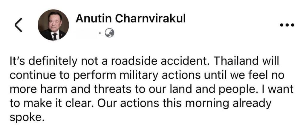 ผู้สื่อข่าวรายงานว่า เวลา 09.35 น. วันที่ 13 ธันวาคม 2568 นายอนุทิน ชาญวีรกูล นายกรัฐมนตรีและรัฐมนตรีว่าการกระทรวงมหาดไทย โพสต์ข้อความผ่านเฟซบุ๊กส่วนตัว “Anutin Charnvirakul” เป็นภาษาอังกฤษ แปลความหมายได้ว่า นายอนุทิน ยืนยันเหตุการณ์ดังกล่าวไม่ใช่อุบัติเหตุจากระเบิดริมถนนอย่างแน่นอน และประเทศไทยจะยังคงดำเนินการทางทหารต่อไป จนกว่าจะมั่นใจว่า ไม่มีอันตรายหรือภัยคุกคามต่อผืนแผ่นดินและประชาชนของไทย
