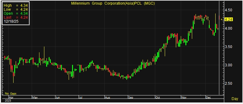 ผู้สื่อข่าวรายงานว่า วันนี้(18 ธ.ค.68)ราคาหุ้นบริษัท มิลเลนเนียม กรุ๊ป คอร์ปอเรชั่น (เอเชีย) จำกัด (มหาชน) หรือ MGC ณ เวลา 10:42 น. อยู่ที่ระดับ 4.24 บาท บวก 0.24 บาท หรือ 6.00% ราคาต่ำสุด 4.24 บาท ราคาสูงสุด 4.34 บาท ด้วยมูลค่าซื้อขาย 0.86 ล้านบาท