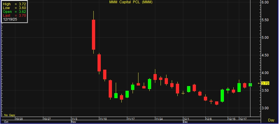 ผู้สื่อข่าวรายงานว่า วันนี้ (19 ธ.ค.68) ราคาหุ้น บริษัท เอ็มเอ็มเอ็ม แคปปิตอล จำกัด (มหาชน) หรือ MMM ณ เวลา 14:25 น. อยู่ที่ระดับ 3.70 บาท บวก 0.12 บาท หรือ 3.35% สูงสุดที่ระดับ 3.72 บาท ต่ำสุดที่ระดับ 3.60 บาท ด้วยมูลค่าการซื้อขาย 8.58 ล้านบาท