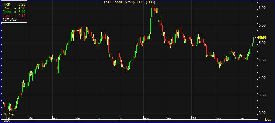 ผู้สื่อข่าวรายงานว่า วันนี้ (19 ธ.ค.68) ราคาหุ้น บริษัท ไทยฟู้ดส์ กรุ๊ป จำกัด (มหาชน) หรือ TFG ณ เวลา 15:07 น. อยู่ที่ระดับ 5.15 บาท บวก 0.17 บาท หรือ 3.41% สูงสุดที่ระดับ 5.20 บาท ต่ำสุดที่ระดับ 4.98 บาท ด้วยมูลค่าการซื้อขาย 123.98 ล้านบาท