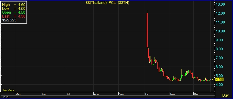 ผู้สื่อข่าวรายงานว่า วันนี้ (23 ธ.ค.68) ราคาหุ้น บริษัท 88(ไทยแลนด์) จำกัด (มหาชน) หรือ 88TH ณ เวลา 10:08 น. อยู่ที่ระดับ 4.56 บาท บวก 0.08 บาท หรือ 1.79% สูงสุดที่ระดับ 4.60 บาท ต่ำสุดที่ระดับ 4.50 บาท ด้วยมูลค่าการซื้อขาย 9.24 ล้านบาท