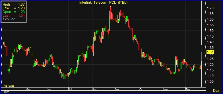 ผู้สื่อข่าวรายงานว่า วันนี้ (23 ธ.ค.68) ราคาหุ้น บริษัท อินเตอร์ลิ้งค์ เทเลคอม จำกัด (มหาชน) หรือ ITEL ณ เวลา 10:27 น. อยู่ที่ระดับ 1.31 บาท บวก 0.14 บาท หรือ 11.97% สูงสุดที่ระดับ 1.37 บาท ต่ำสุดที่ระดับ 1.23 บาท ด้วยมูลค่าการซื้อขาย 10.95 ล้านบาท