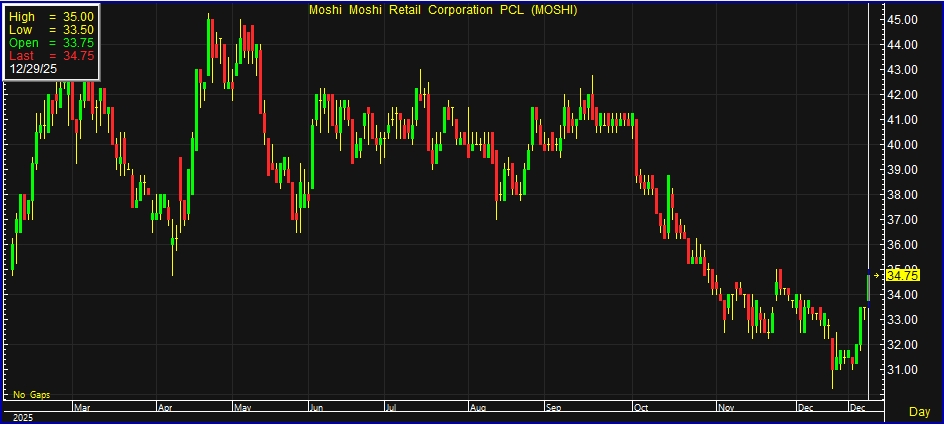 ผู้สื่อข่าวรายงานว่า วันนี้ (29 ธ.ค.68) ราคาหุ้น บริษัท โมชิ โมชิ รีเทล คอร์ปอเรชั่น จำกัด (มหาชน) หรือ MOSHI ณ เวลา 15:26 น. อยู่ที่ระดับ 34.75 บาท บวก 1.25 บาท หรือ 3.73% สูงสุดที่ระดับ 35 บาท ต่ำสุดที่ระดับ 33.50 บาท ด้วยมูลค่าการซื้อขาย 35.32 ล้านบาท