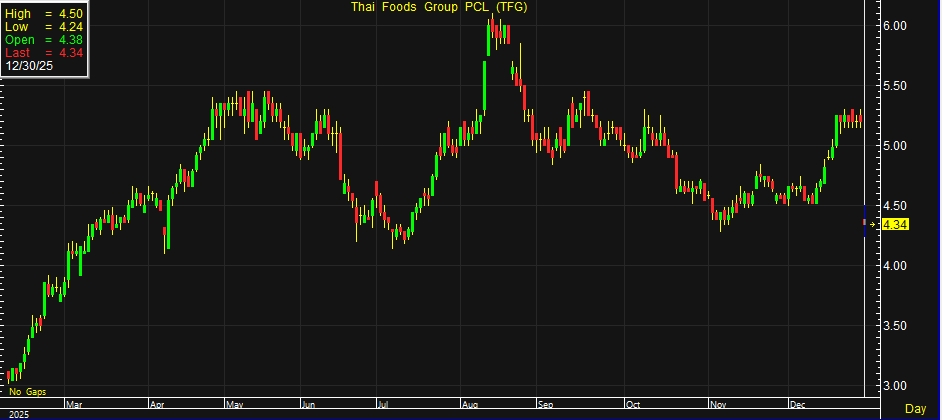 ผู้สื่อข่าวรายงานว่า วันนี้ (30 ธ.ค.68) ราคาหุ้น บริษัท ไทยฟู้ดส์ กรุ๊ป จำกัด (มหาชน) หรือ TFG ณ เวลา 10:03 น. อยู่ที่ระดับ 4.34 บาท ลบ 0.86 บาท หรือ 16.54% สูงสุดที่ระดับ 4.50 บาท ต่ำสุดที่ระดับ 4.24 บาท ด้วยมูลค่าการซื้อขาย 115.06 ล้านบาท