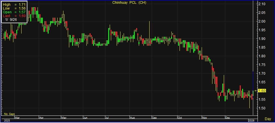 ผู้สื่อข่าวรายงานว่า วันนี้ (9 ม.ค.69) ราคาหุ้น บริษัท เจริญอุตสาหกรรม จำกัด (มหาชน) หรือ CH ณ เวลา 12:10 น. อยู่ที่ระดับ 1.60 บาท บวก 0.05 บาท หรือ 3.23% สูงสุดที่ระดับ 1.71 บาท ต่ำสุดที่ระดับ 1.56 บาท ด้วยมูลค่าการซื้อขาย 0.39 ล้านบาท