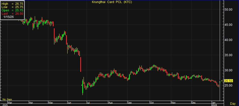 ผู้สื่อข่าวรายงานว่า วันนี้ (15 ม.ค.69) ราคาหุ้นบริษัท บัตรกรุงไทย จำกัด (มหาชน) หรือ KTC ณ เวลา 11:01 น. อยู่ที่ระดับ 26.50 บาท บวก 1.70 บาท หรือ 6.85% ราคาสูงสุด 26.75 บาท ราคาต่ำสุด 25.75 บาท ด้วยมูลค่าซื้อขาย 282.36 ล้านบาท